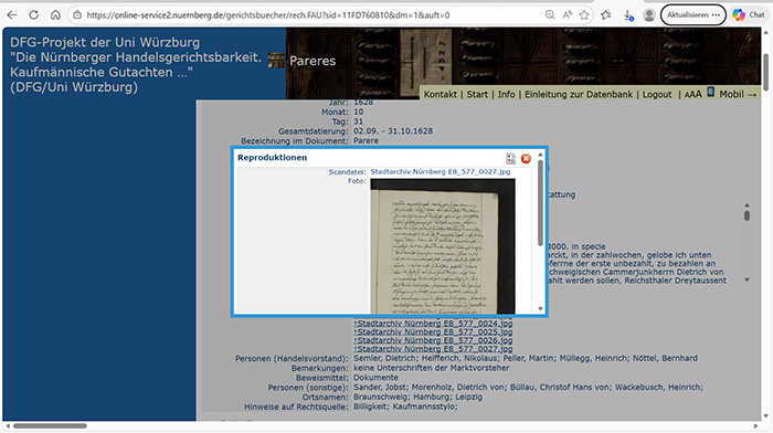 Ziel des Projekts war es, die sogenannten Nürnberger Pareres – kaufmännische Gutachten zu handelsrechtlichen Streitfragen – systematisch zu erschließen, der Öffentlichkeit digital zugänglich zu machen und in einem weiteren Schritt wissenschaftlich auszuwerten. Wie die Stadt Nürnberg in einer Pressemitteilung schreibt, biete die Datenbank Forscherinnen und Forschern sowie historisch Interessierten einen neuartigen Zugang zu einer in Europa einzigartigen Quellenüberlieferung.