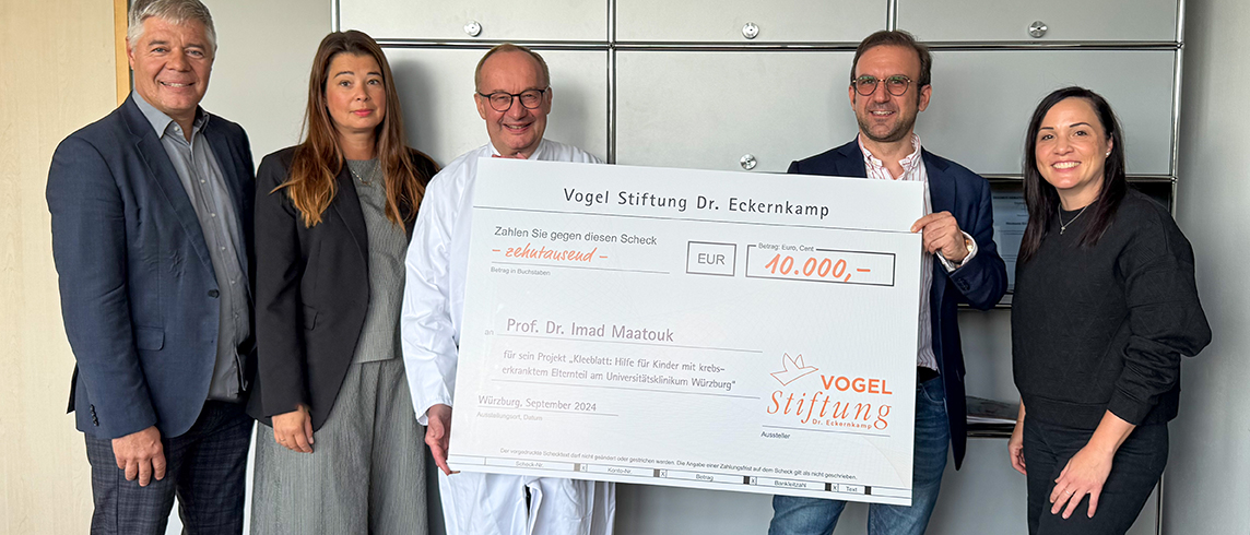 Die Vogel Stiftung Dr. Eckernkamp (Würzburg) hat dem Universitätsklinikum Würzburg (UKW) eine Spende von 10.000 Euro für das Projekt „Kleeblatt“ übergeben. Dieses Beratungsangebot richtet sich an Familien, bei denen ein Elternteil an Krebs erkrankt ist. Mit der Spende wird Lehrmaterial für Kinder bereitgestellt, das ihnen hilft, die Erkrankung ihrer Eltern besser zu verstehen. Die Eltern werden dabei unterstützt, die richtigen Worte zu finden.