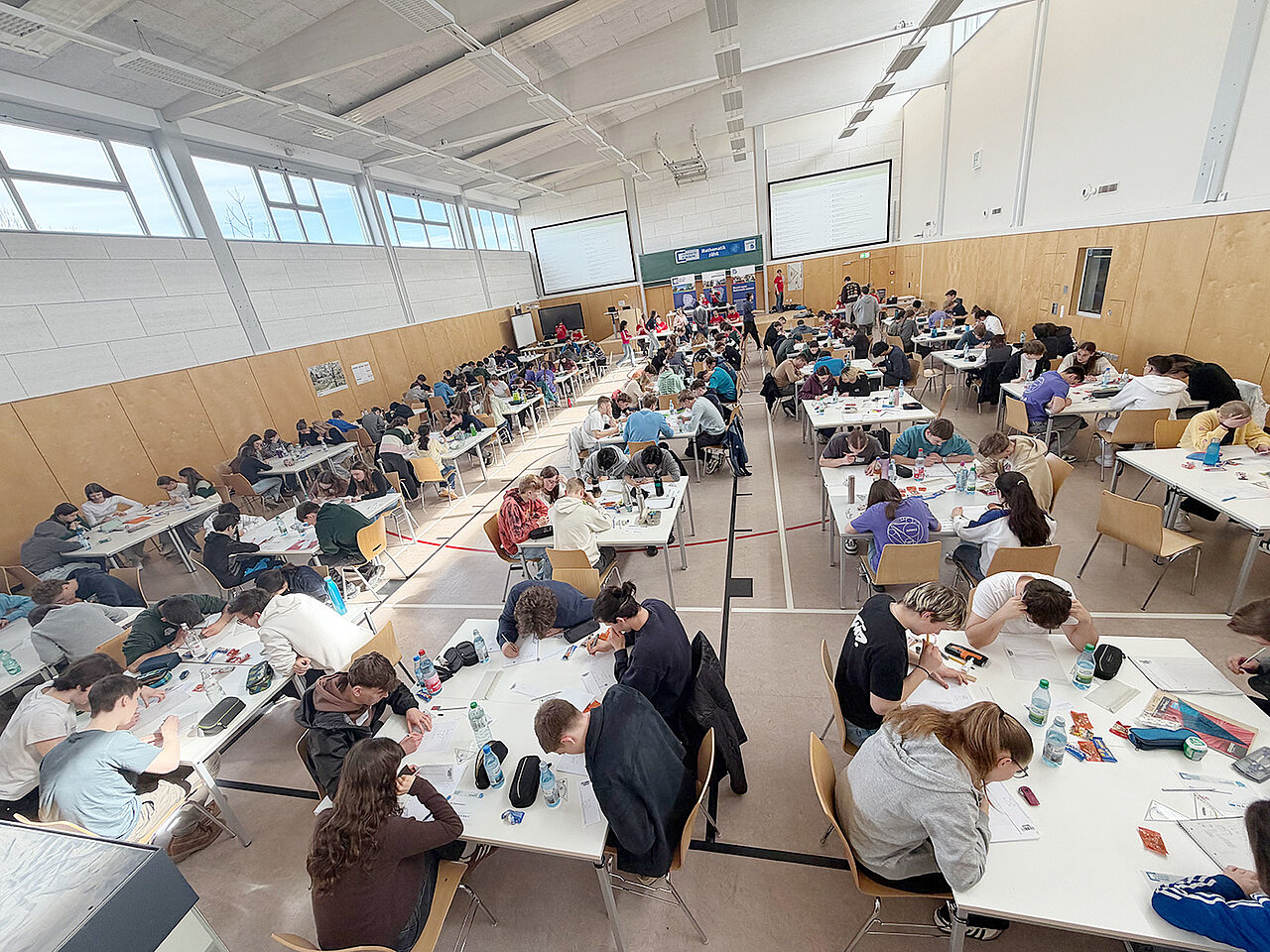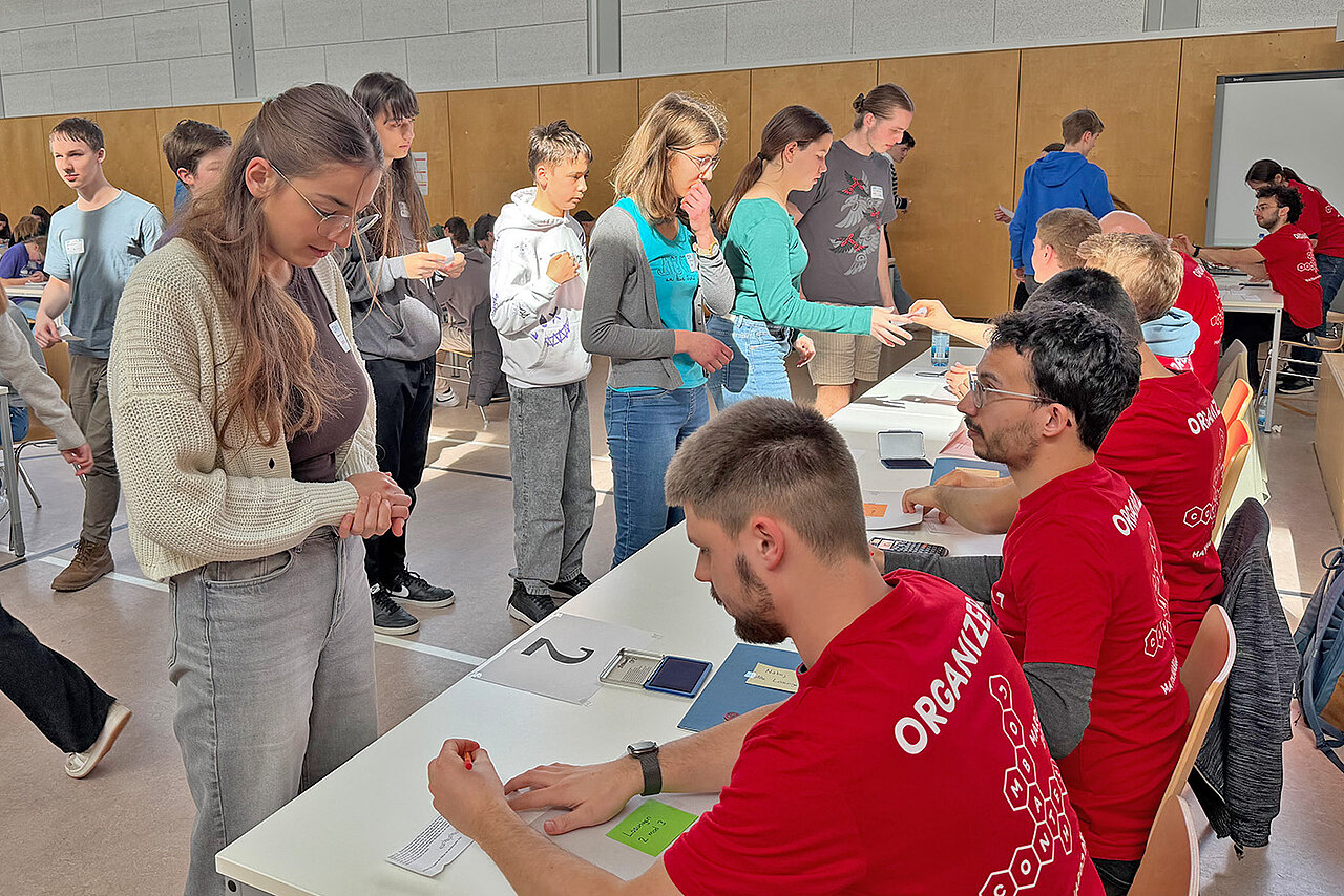 151 Mathematikbegeisterte, die an Tischen über kniffligen Zahlenrätseln brüten, hin- und herrennen, um ihre Lösungen prüfen zu lassen, im Team diskutieren, knobeln und lachen. Auf der anderen Seite Mathematikerinnen und Mathematiker des Instituts für Mathematik, die diese Lösungen überprüfen, neue Aufgaben verteilen und mitfiebern.