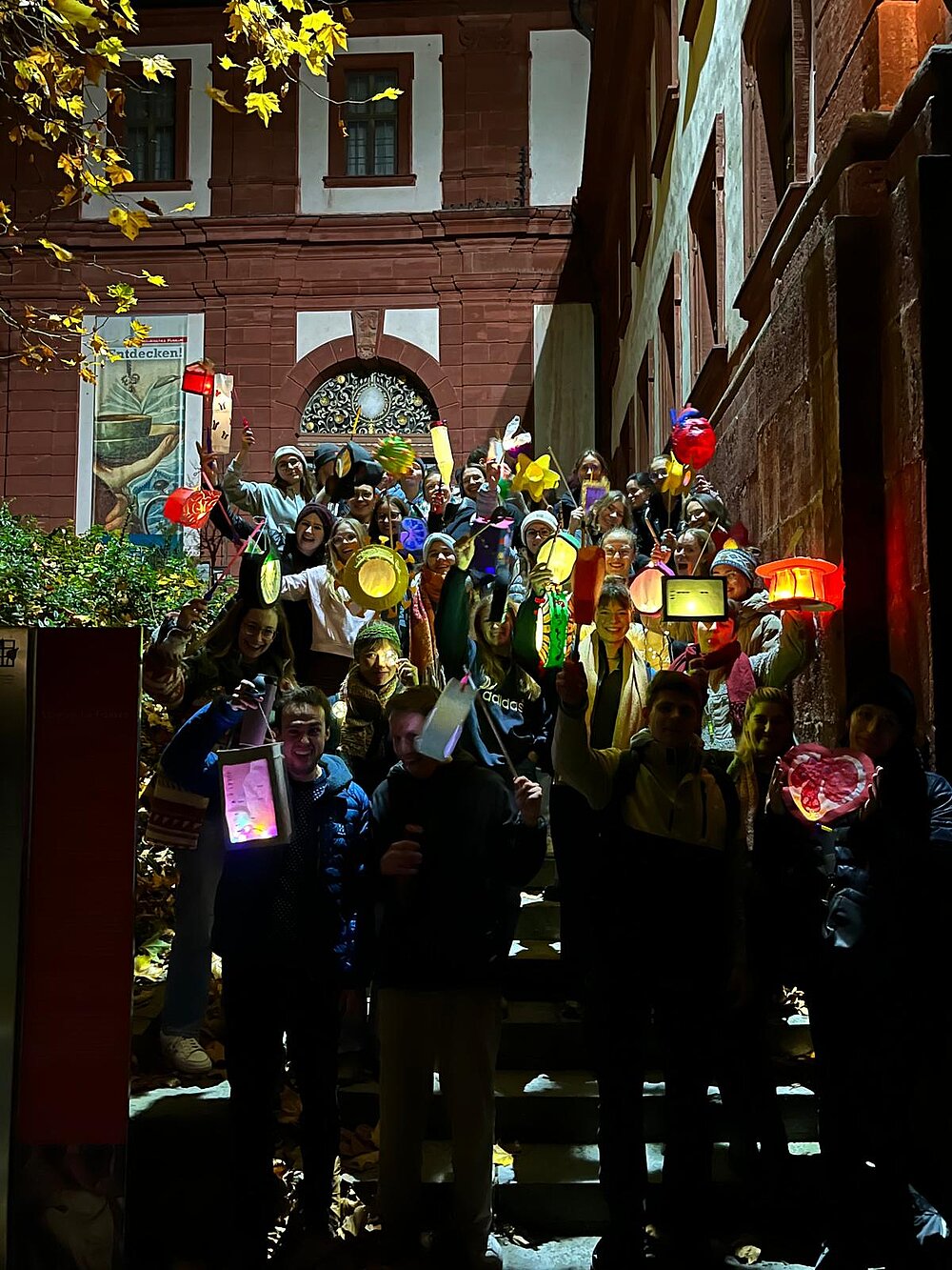 Am Abend trafen sich knapp 30 Studierende aus allen Semestern, Freunde und auch ehemalige Kommilitonen am Vierröhrenbrunnen in der Würzburger Innenstadt, um gemeinsam den steilen Weg auf den Marienberg zu bewältigen. Beleuchtet von selbstgebastelten Laternen – darunter Einhörner, Zellen und ein Herz – und munter Laternenlieder singend erreichten wir einen guten Aussichtspunkt an der Festung, von wo aus man fast die ganze Stadt überblicken konnte. Unsere wohl beeindruckende Erscheinung verhalf uns dabei sogar zu einem kurzen Moment des Ruhmes in den sozialen Medien, Jodel lässt grüßen!