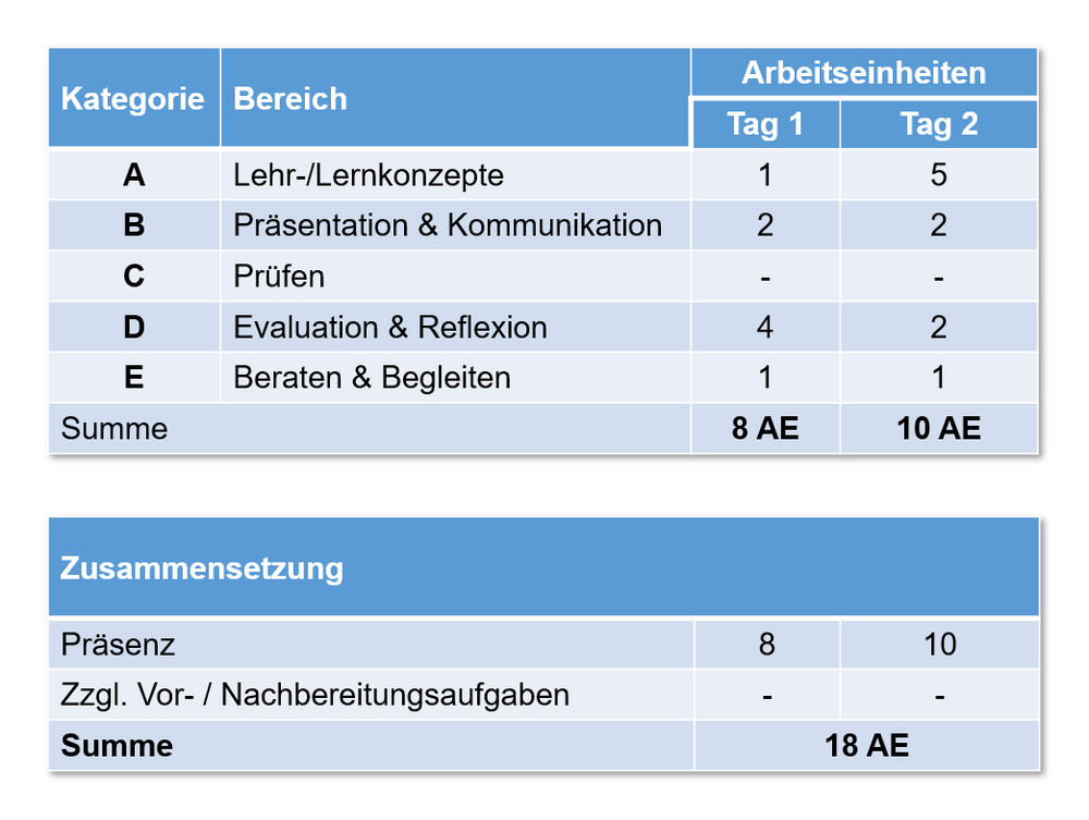 18 Arbeitseinheiten (AE), aufgeteilt in 2 Präsenztage (14 AE) zzgl. Vor- und Nachbereitungsaufgaben (4 AE)