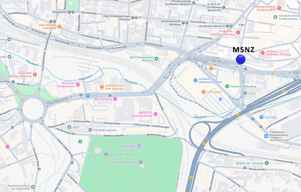 Our office is located in the Europahaus, close to Schweinfurter Straße (bus stop Europastern) and not far from the campus of the University Hospital. You will find us on