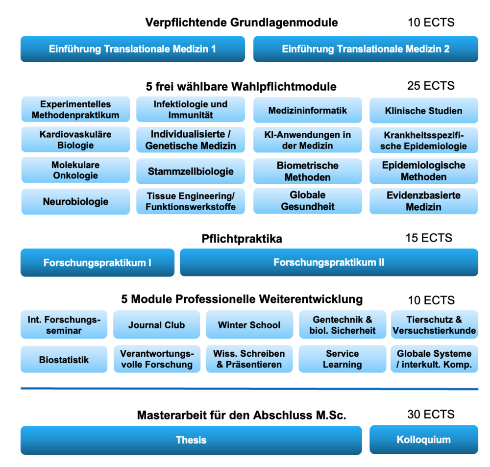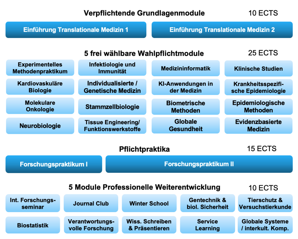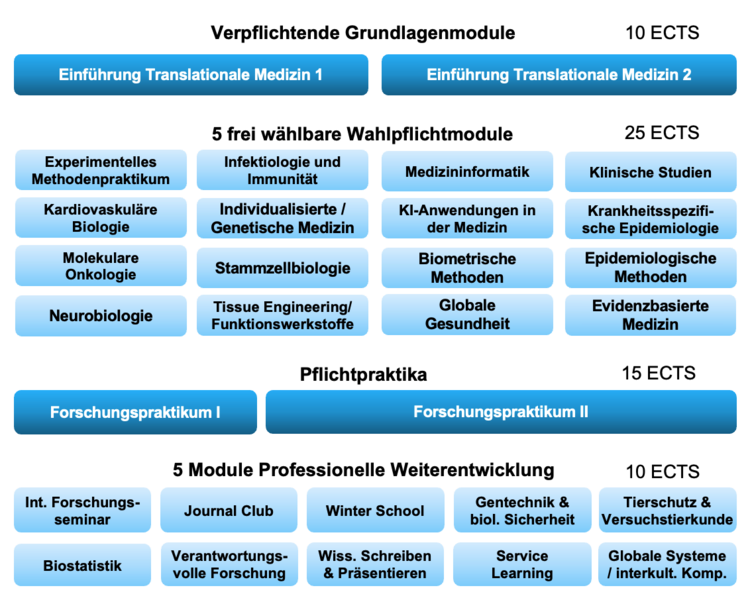 Der Zusatzstudiengang wird parallel zum klinischen Abschnitt absolviert. In den beiden Pflichtmodulen „Einführung in die Experimentelle Medizin“ und „Einführung in die klinische Forschung/Epidemiologie“ werden verschiedene Aspekte der Translationalen Medizin eingeführt, sowohl aus Sicht der Grundlagenforschung als auch aus Sicht der klinischen Forschung an ausgewählten Beispielen erläutert.